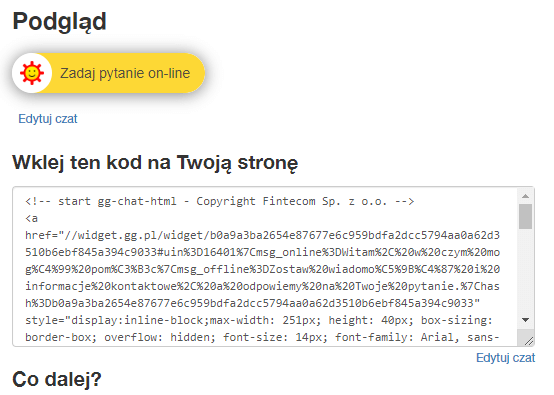 - Przy aktywnej subskrypcji GGchat pojawi się unikalny kod html na Twoją stronę. Skopiuj kod, i wklej go na Swoją stronę internetową.